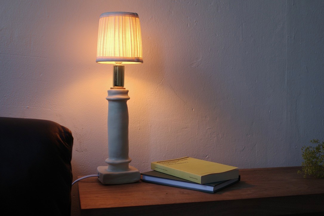Desk lamp, 2024. Ceramic stoneware body with alabaster glaze, hand wired, pleated lampshade